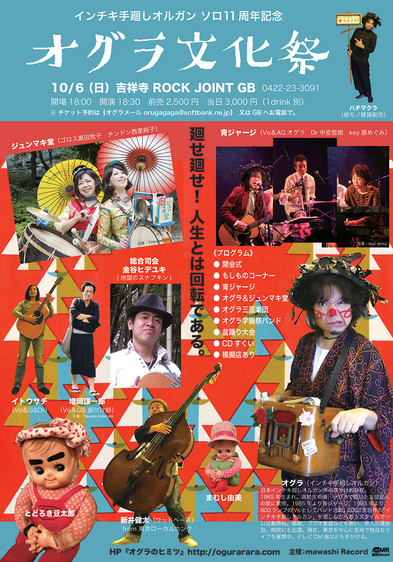 通販はコチラへ 枚数、お名前、住所をメールして下さい。 振込先を返信いたします。 送料無料! ☆『廻転唱歌』/オグラ&ジュンマキ堂 税込定価¥1,000(税込価格) レーベル:廻詞Record 品番:MWR-003 2013年発売 収録曲 1.おぼろ月夜 2.夏は来ぬ 3.旅愁 4.冬景色 5.故郷を離るる歌 6.お弁当つくって(オリジナル) 7.冬の星座 |