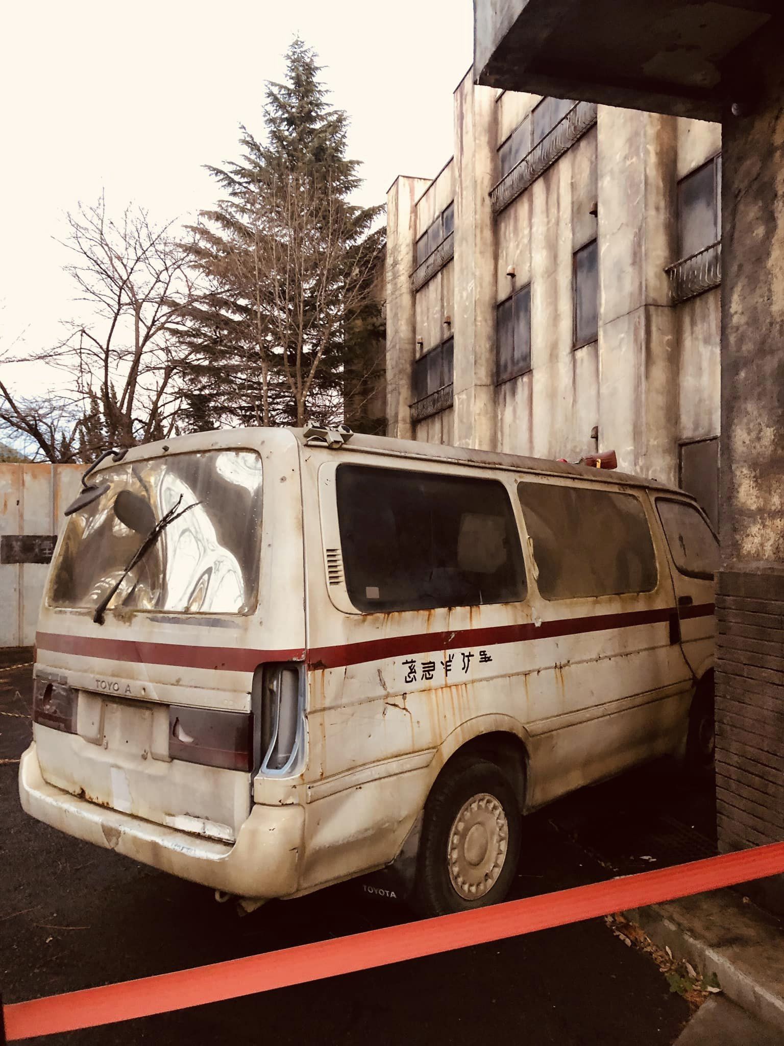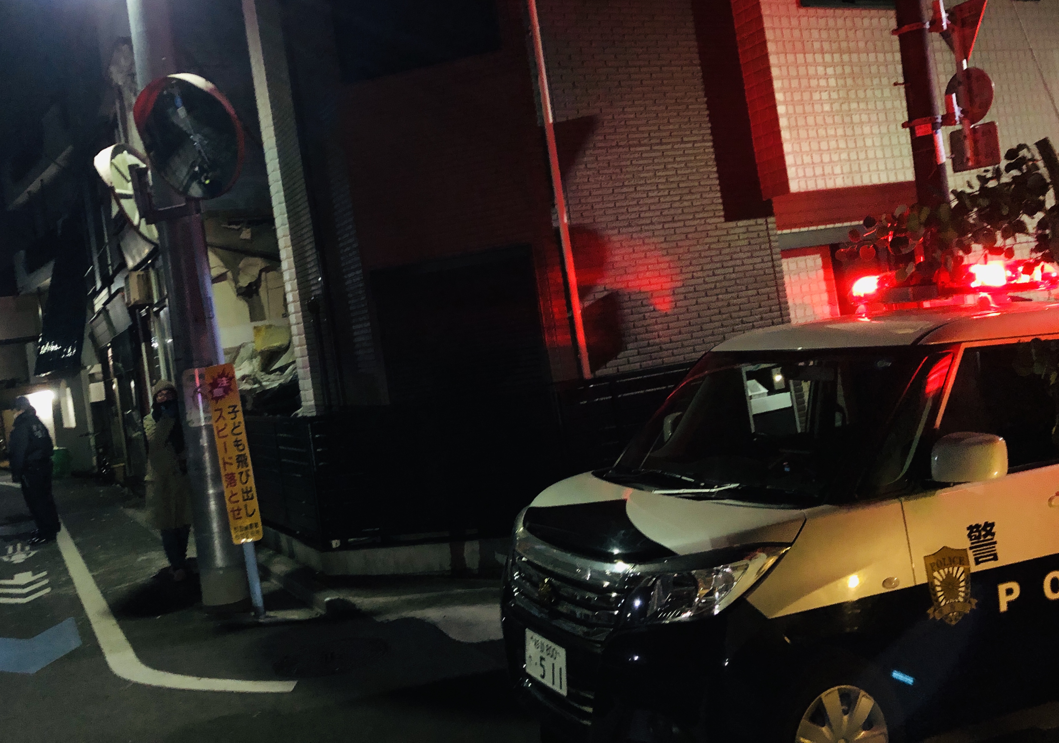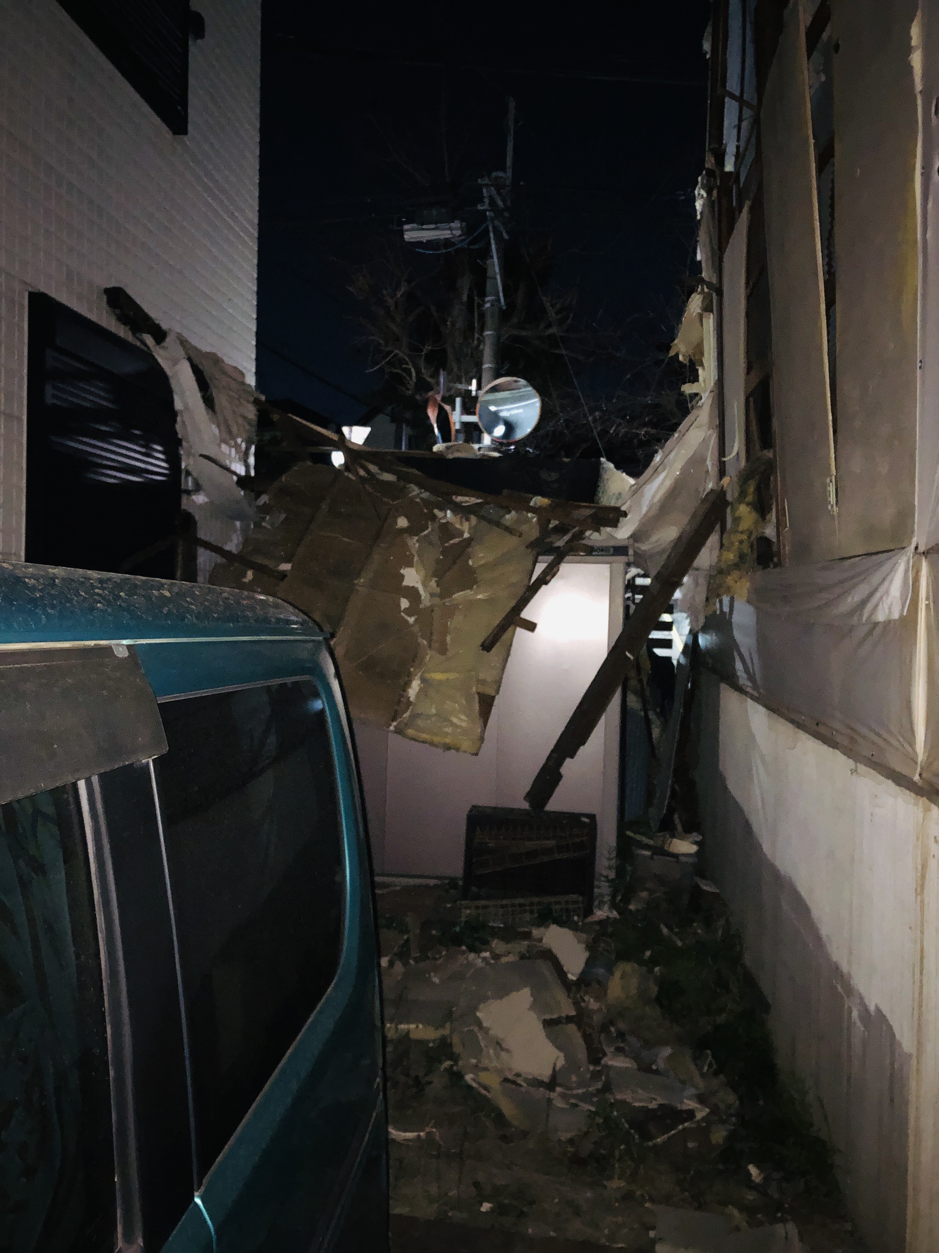 警察と消防署は応急処置で2階の柱を紐でくくり、道路へ落下した一部のガラをなぜか物置きの上へ重ね帰還。