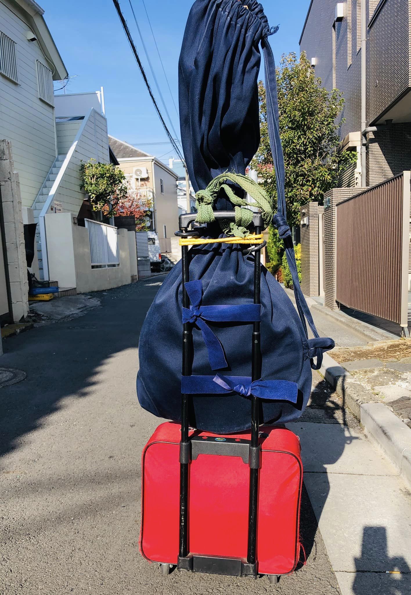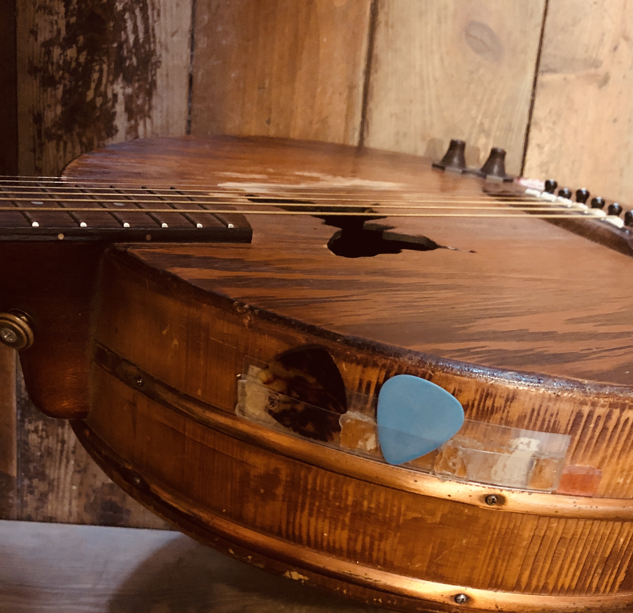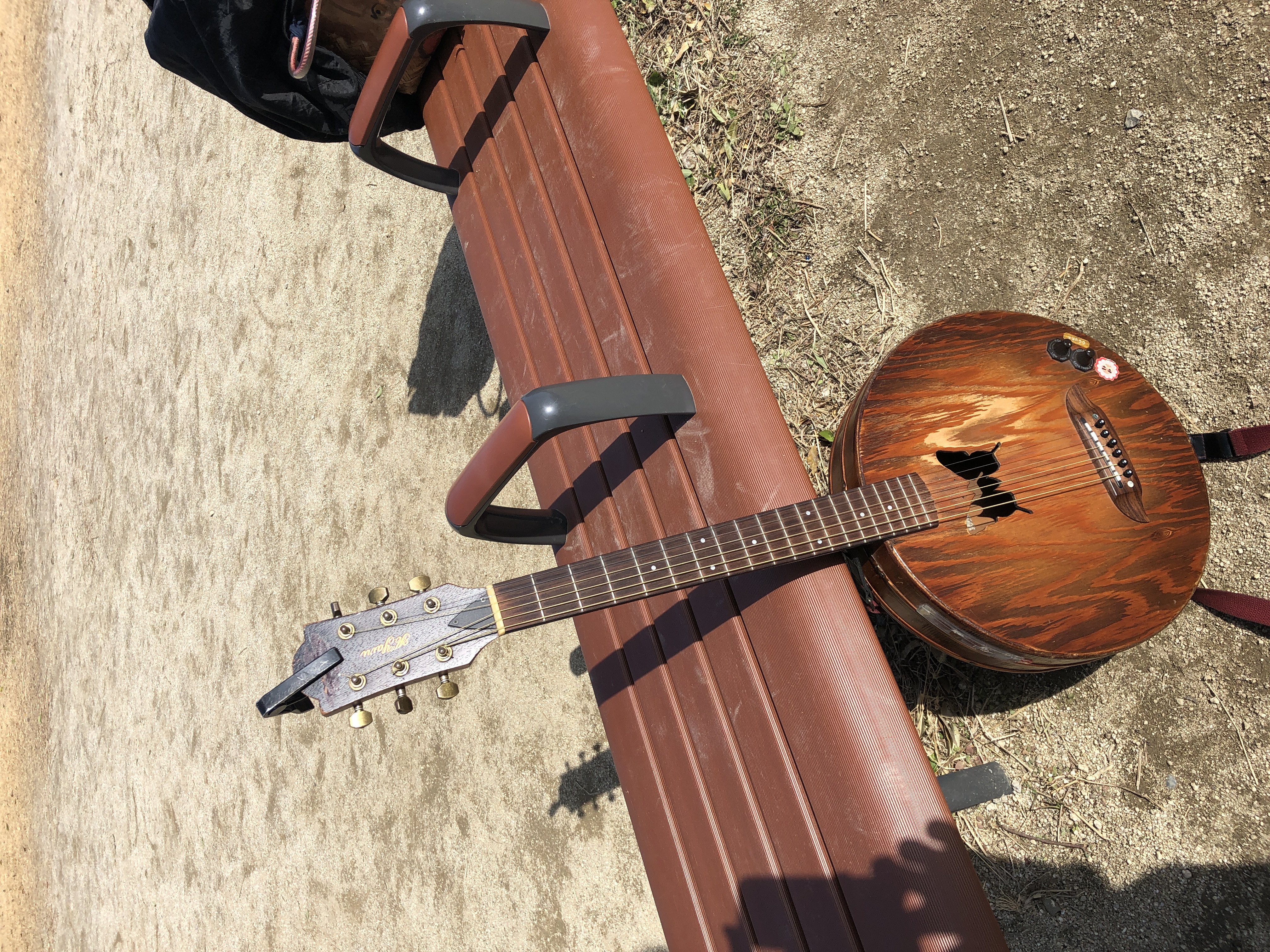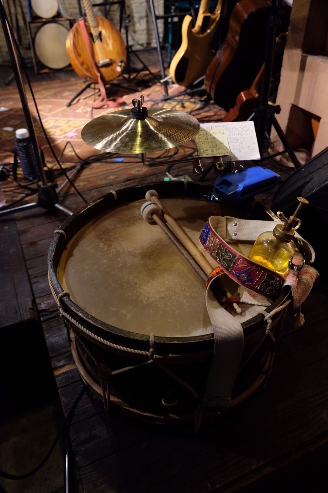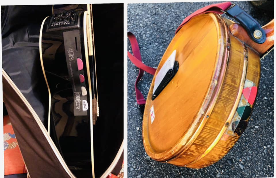 また工夫しちゃった。桶ギター丸くて安定しないので固定リボン装着!海賊のように縫ったぜ。
