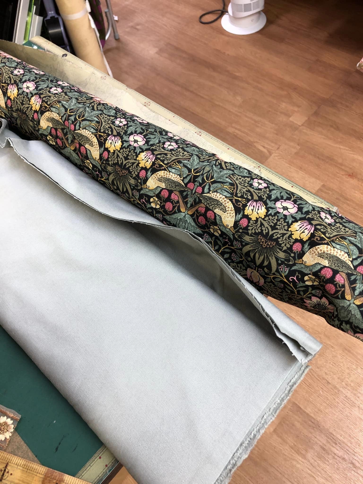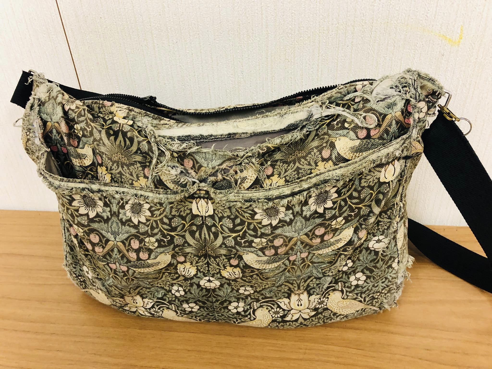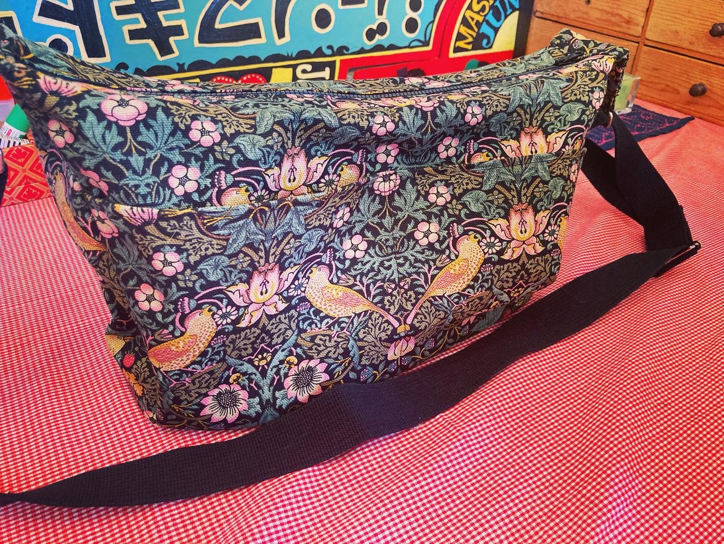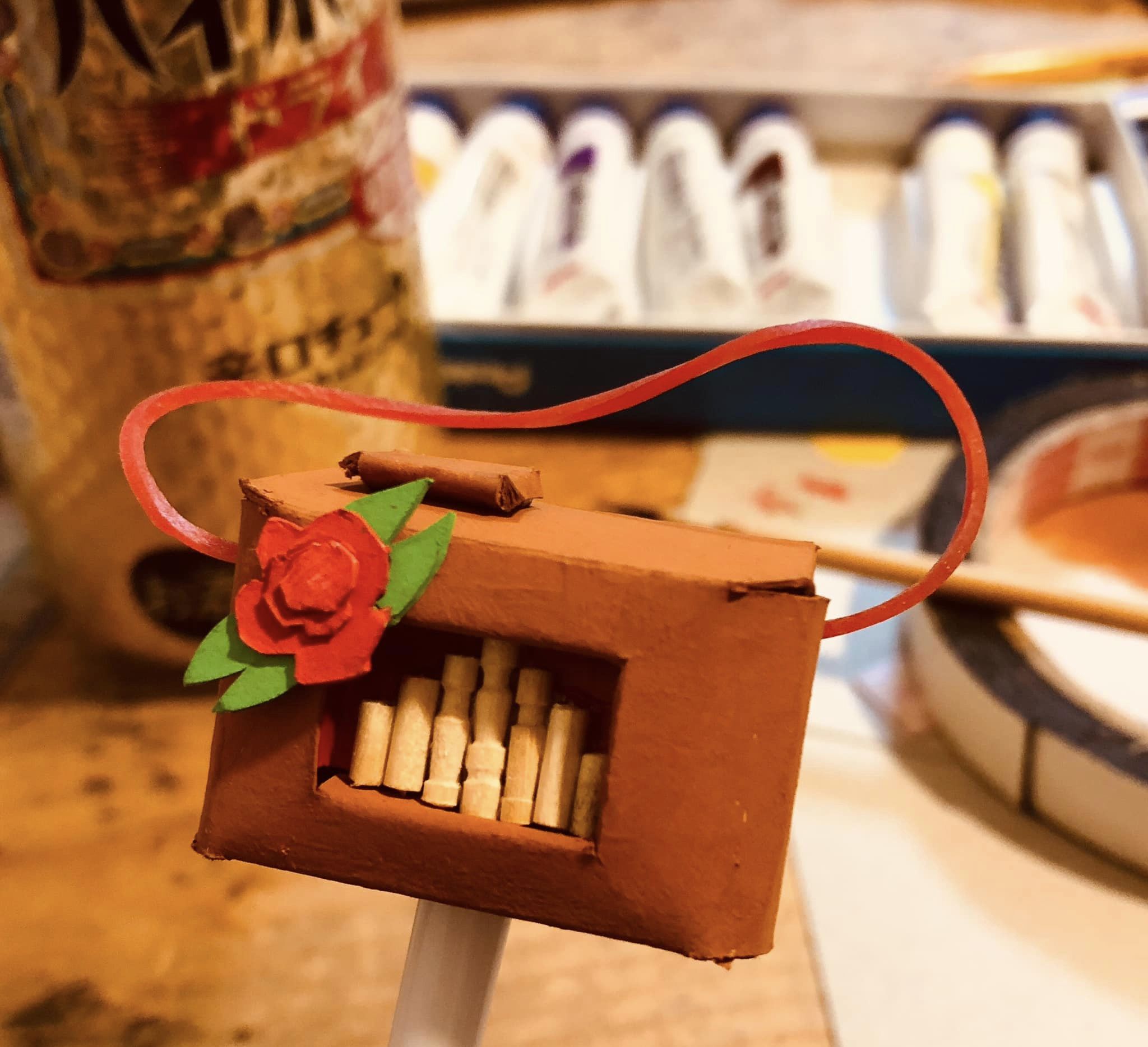 また工夫しちゃった。桶ギター丸くて安定しないので固定リボン装着!海賊のように縫ったぜ。