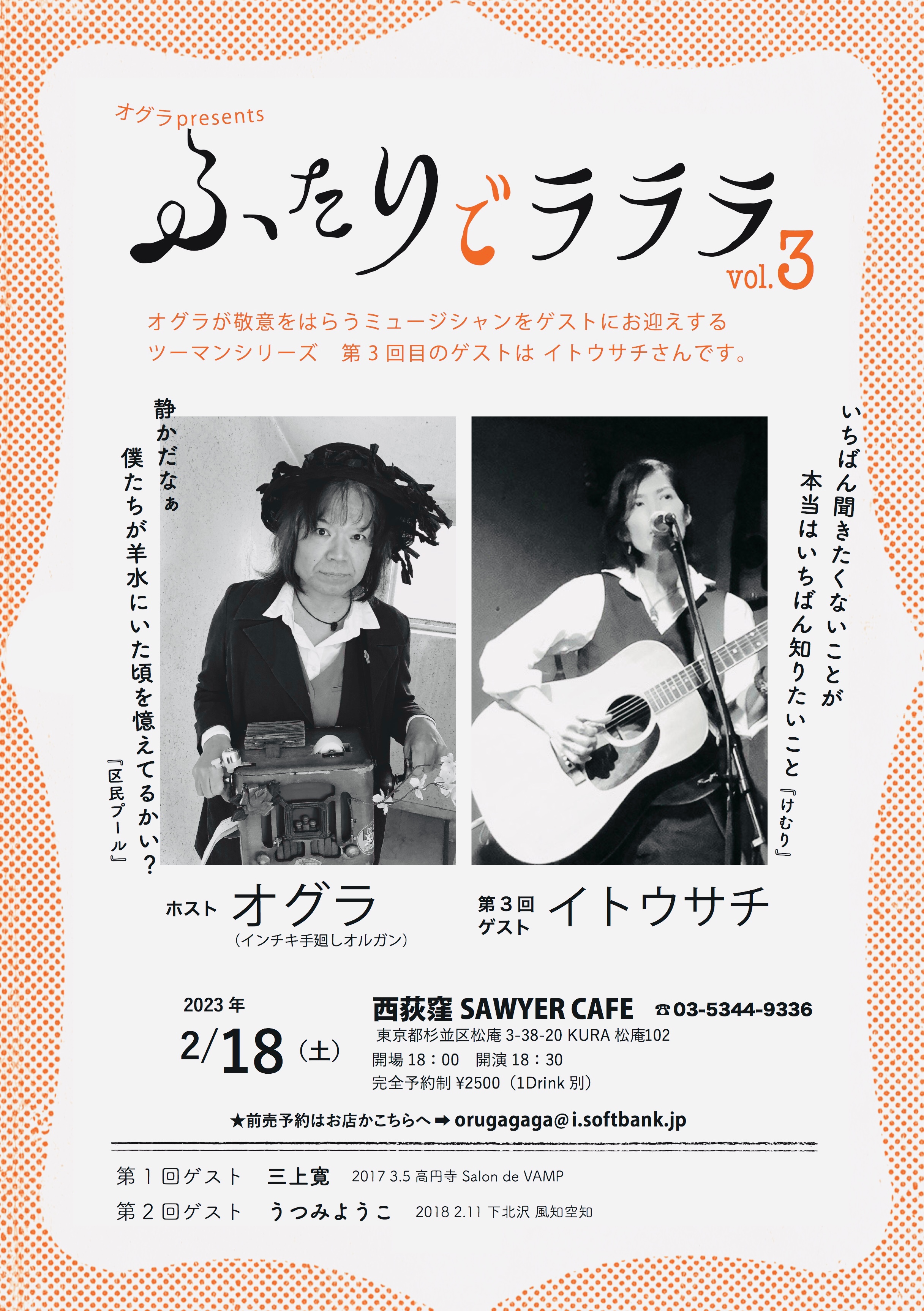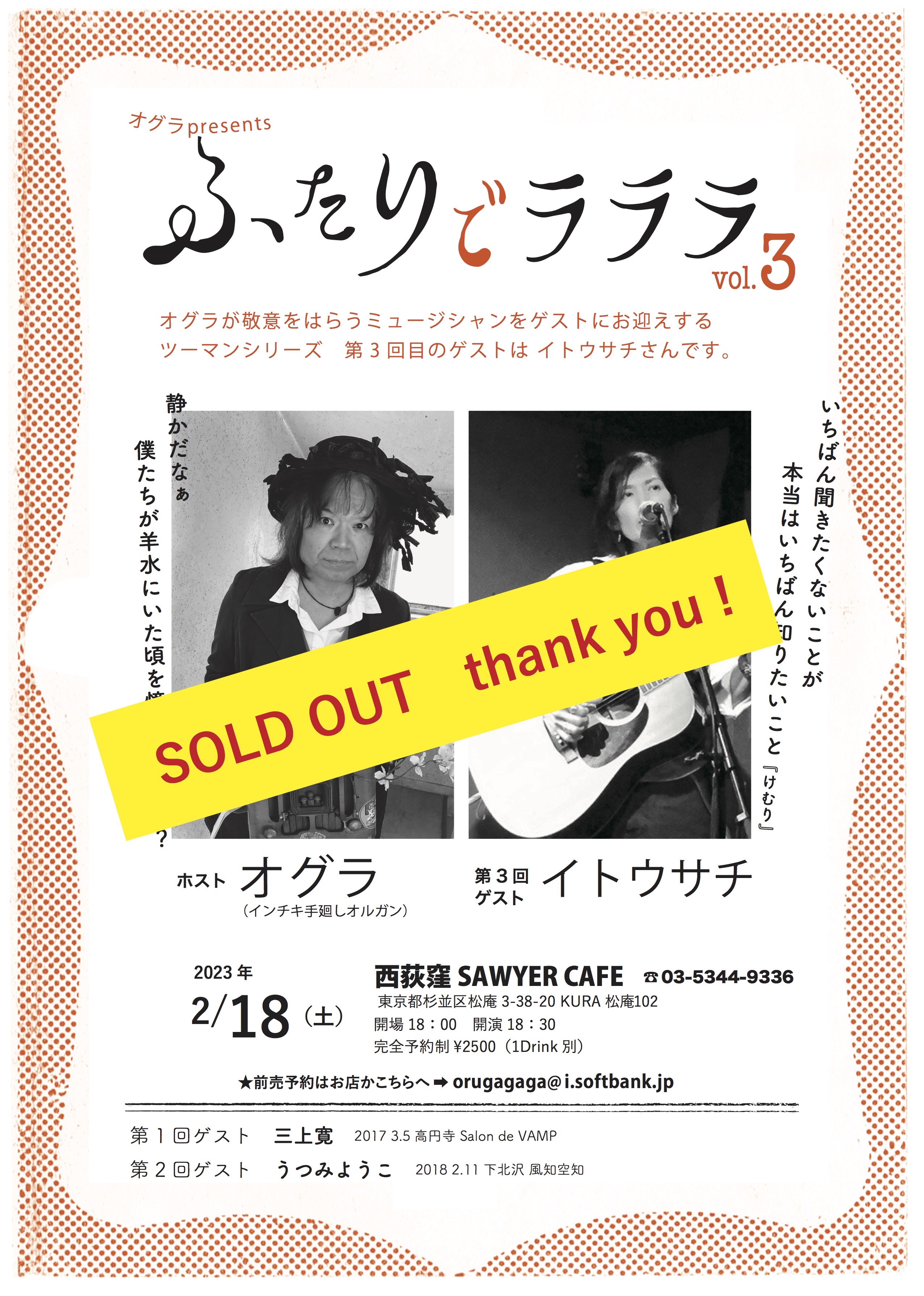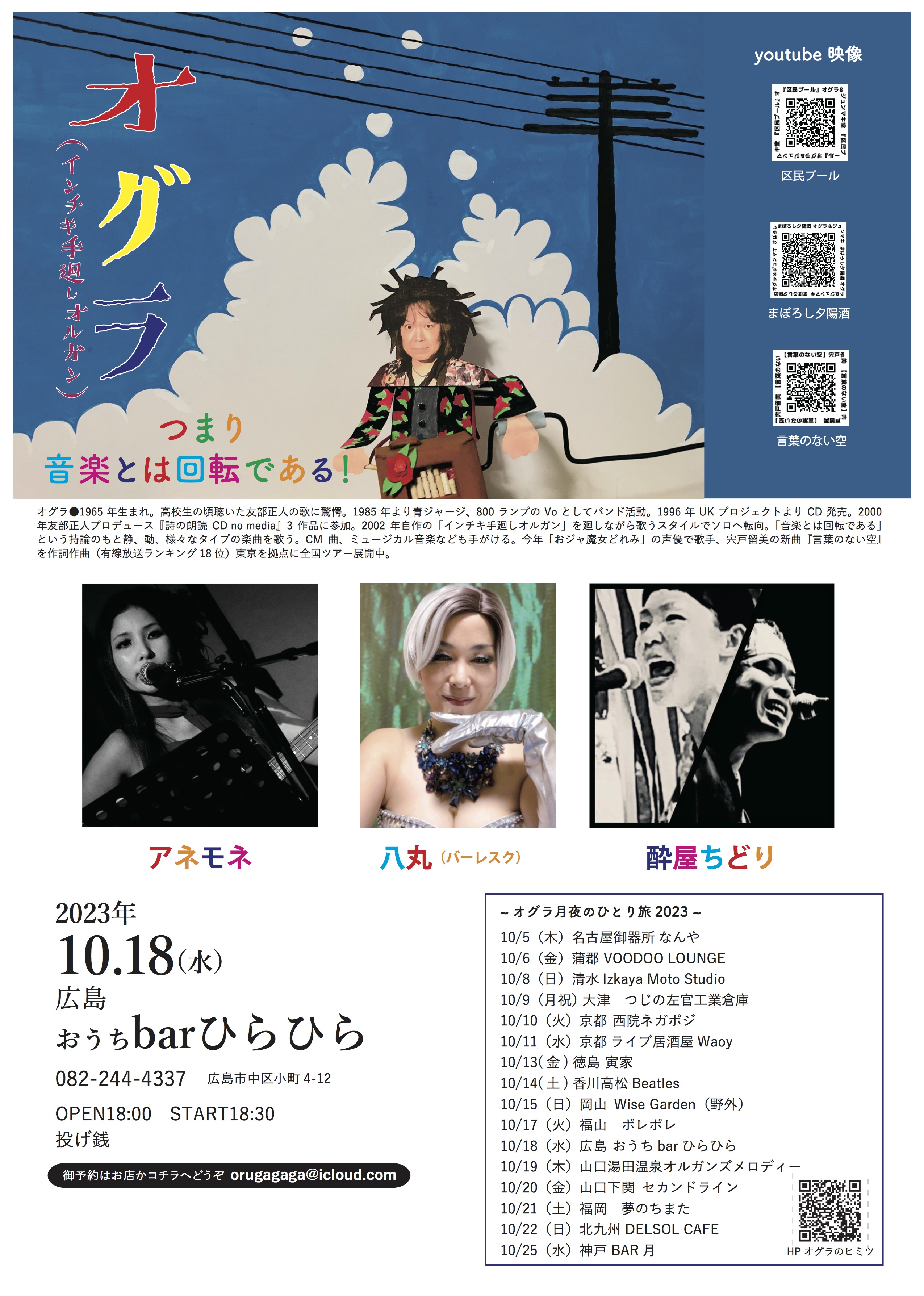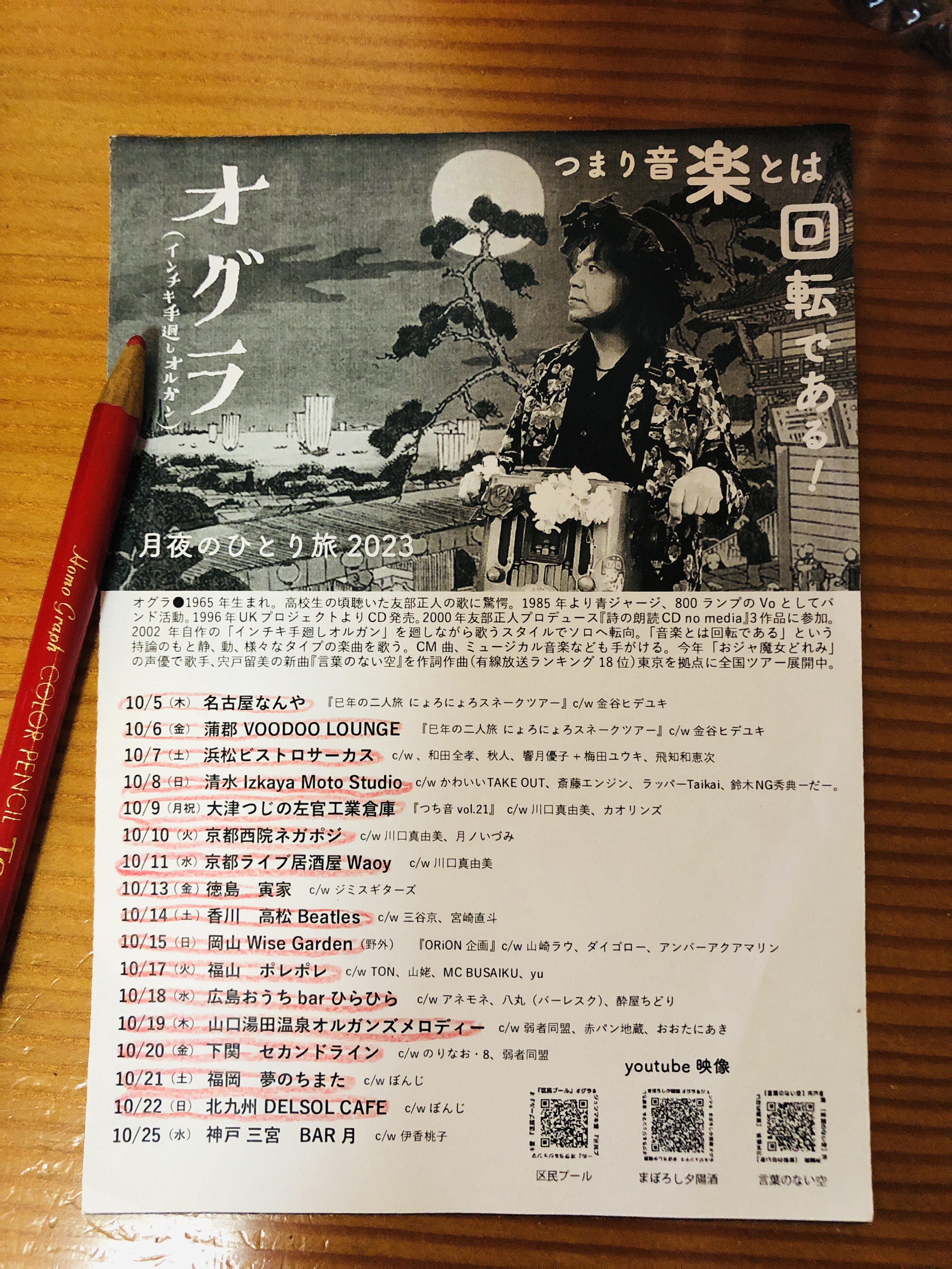 HP「オグラのヒミツ」を運営してくれてる篠やん、『寿町フリーコンサート実行委員会』松沢さん、金子ぶーさん、佐藤さん、園田さん、竹内さん、荒井さん親子、PA佐藤さん、遠峰あこさん、パギさん、生活館スタッフの皆さん、『ニュー風知空知』柏原さん、田中さん、じゅんさん、徳毛さん、『SAWYER CAFE 』コミーさん、宏暢さん、てっしー、サッちゃん『浜松エスケリータ68』後藤さん、マダム、ライオンちゃん、王子、十夢てん、堀内さん、チャンプさん&奥さん『足助のかじやさん』広瀬さん&スタッフのみなさん、安藤さん、葉さん、日々かりめろの御二人、いわさきけんちゃん、旅籠の女将さん、『焼き鳥元ちゃん』ロータスともちゃん、元ちゃん&母上、しげるさん、ズキューンの御二人、エリーダスマンの皆んな、谷口&奥方、『ぐらBAR’S』ママさん、マスター、かんなさん、大島さん、田代さん、間藤さん、小百合さん、犬ゾンビーズ、シモちゃん、ニッシー、宗野敏男そうちゃん、ミシゴめぐちゃん、宮城さん、城さん、瑞穂ちゃん、ディレッタントママさん&ふみえちゃん『難波屋』筒井さん、ヨッシーさん、さとちゃん、桃ちゃん、天四郎さん、日高さん、ヨッシーさん『大津つじの左官工業倉庫』つっちぃさん、カオリンズうっちーさん&カオリンさん、月ノいずみちゃん、アキヒトくん『Casa Midori 』みんみんさん、母上、ぱーこちゃん、虎大朗君、龍之介君、きんた、まかお、水星さん、だくちゃんりっちゃん、yO’ceansさん、サトチエさん、井上エリナさん、サンシモンさん、高平悠さん、平四郎さん、まよい猫さ『ちどり座』トモローさん、かよさん、ちょこもんさん、一級河川荒川団の皆さん、ゑ川史子さん、YugletWaterlooJugBandの皆の衆、鈴木さん、堀江淳さん、天田えまさん、田中さん、宍戸留美ちゃん、多田さん、母上、妹さん、カブちゃん、泥酔紳士、鈴木さん『第32回下北沢音楽祭』金子さん、スマイリー原島さん、マキちゃん、滝君、下北沢音楽祭運営スタッフの皆さん、ハッチゃん、Lちゃん『岩倉市コミュニティカフェかがよひ』岸さん、晴さん、川合ケンさん、泰造くんファミリー、『恵那市 音楽酒房ともばぁ』ともさん、はるさん、りすけさん、大井ちゃん、カリくん、万葉さん、加藤さん、猫どん(リズム、いよは、ドレミ、デュカ、シオン、エナ、ポチ、こまめ、あられ、メルモ)、『岐阜 高山ピースランド』中神さん、みのちゃん、ユウスケさん、『富山 音楽酒家 村門』樹さん、ペコさん、さゆりさん、福田さん、後藤さん、『金沢 JelousGuy』詩野りん、チャオさん、中井さん、あんちゃん、Shokoちゃん、理介さん、『台東区 泪橋ホール』裕美子さん、スタッフの皆さん、加集さん、サミーさん、『神田 THE SHOJIMARU』アザーガート ダイちゃん、章二丸さん、海老原さん、コスゲさん、『下北沢CLUB Que』二位さん、中村さん、高田さん、高橋さん、高橋さん、高橋さん、福永さん、生田さん、辻さん、『清水Drinkin' beer! HAM』岩ちゃん、はぎちゃん、宗ちゃん、貝殻s、BUMBLE BEATS、みっちゃん、テクちゃん、エンジン君、ハッコー、『三島ぐらBAR亭』マスター&グラママさん、スタッフさん、保雄君&あきこさん、世古さん、ゆかしさん、『長野ロズカフェ』丸山さん、利香さん、徹さん、合波さん、中村さん、小山さん、安沙奈さん、真美さん、真彩さん、ヒロさん、徹さん、彩音ちゃん、百福くん、なつめちゃん、荒井さん、樋口さん、『名古屋なんや』ぷよさん、G子さん、蘭さん、カリ子さん、麻紀ねえ、坂ちん、『蒲郡 VOODOO LOUNGE』きんちゃん、りょうや君、金谷ん、きんママさん、『浜松ビストロサーカス』かまたさん、Lillyさん、ユキエさん、たかこさん、ユウちゃん、ユウキさん、『清水Izkaya Moto Studio』元さん、麻友さん、えりたす&ひでたすさん、Taiki君、『京都西院ネガポジ』表現太郎ひょうさん、川口真由美ん、月ノいづみちゃん、スタッフの皆さん、『京都ライブ居酒屋Waoy』塩田さん、宇宙さん、びょうさん『徳島寅家』寅さん、明子さん、ジミスギター加藤さん、るりさん、『高松Beatles』新谷さん、京ちゃん、宮崎君、ゾミさん、☆NORi☆さん『岡山Wise Garden』大森さん、純子さん、お母さん、諒君、やぶさん、あゆちゃん、山崎ラウさん、ダイゴローさん、アンバーアクアマリンさん『福山ポレポレ』ゆうさん、じっちゃん、TON君、MC BUSAIKUさん『広島ひらひら』アネモネ&マサル、八丸さん、ムキムキ君、みかりん『湯田温泉オルガンズメロディー』英三さん、ゾエ、おおたにさん、よねさん『下関セカンドライン』酒本さん、慧音さん、スタッフの皆さん、のりなお・8の皆さん福本さん、Sちゃんご夫妻、でぇ吉さん、串崎さん、『福岡夢のちまた』ジンロウさん、ぼんじさん、あゆみさん『北九州DELSOL CAFE』大場さん御夫妻、Masakiさん、せんくん&あやか『馬橋盆踊り』狩野さん、榎本さん、町内の皆さん、遠路遥々来てくれた踊り手さん、太鼓の皆さん、天狗連の皆さん、ペリ